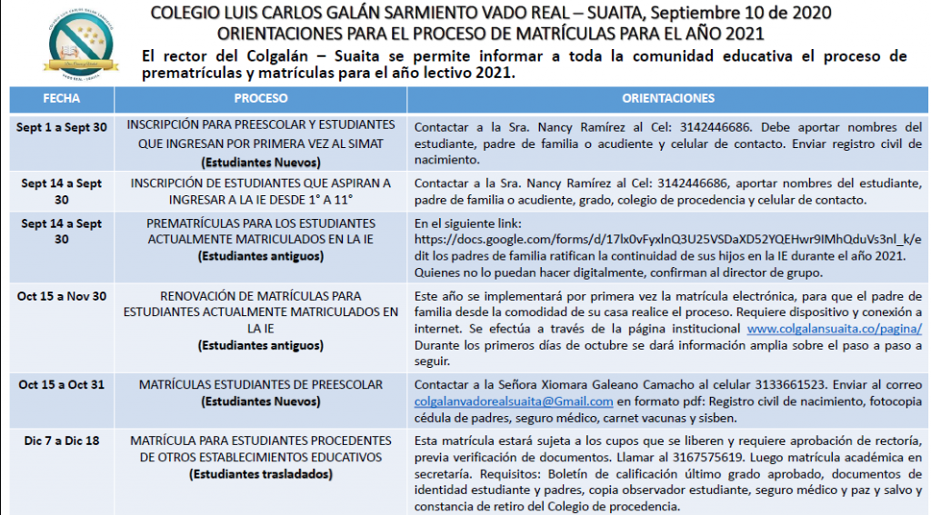 El rector del Colegio Luis Carlos Galán Sarmiento de Suaita se permite informar a toda la comunidad educativa el proceso de prematrículas y matrículas para el año lectivo 2021.