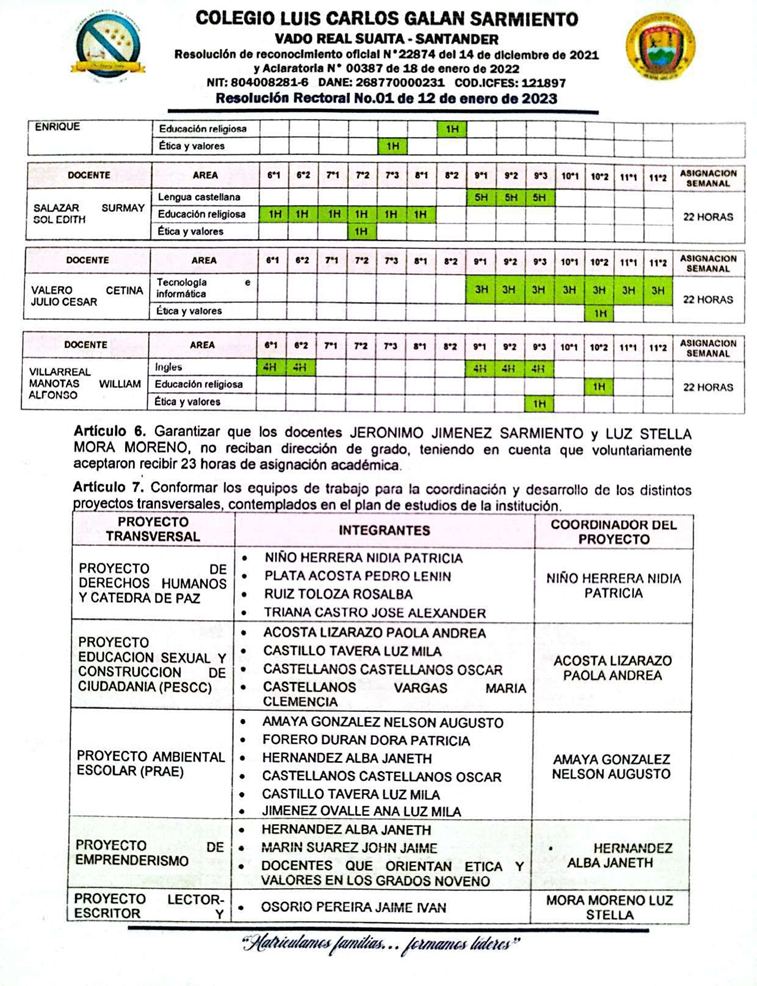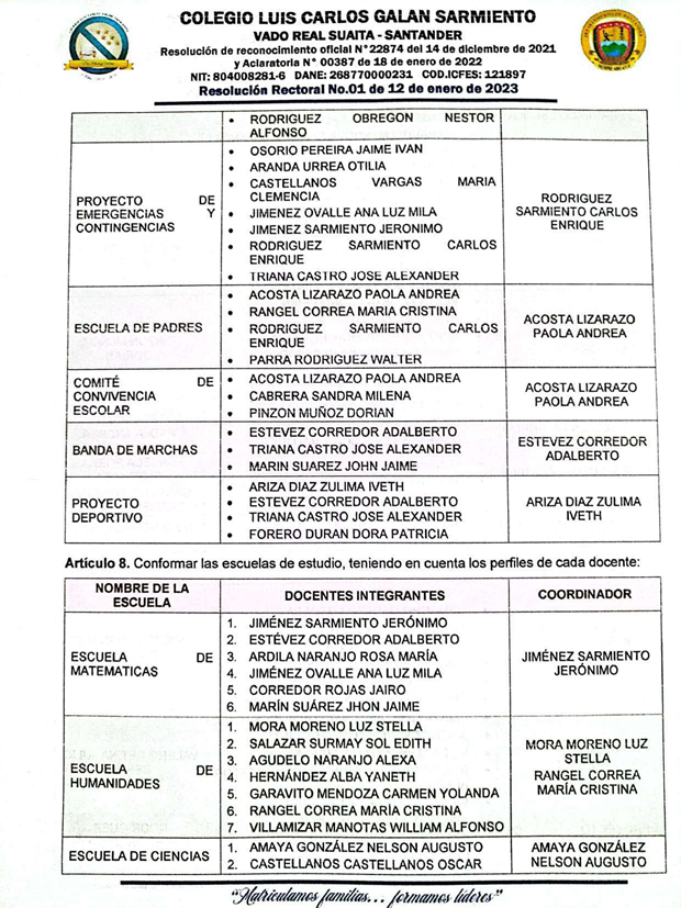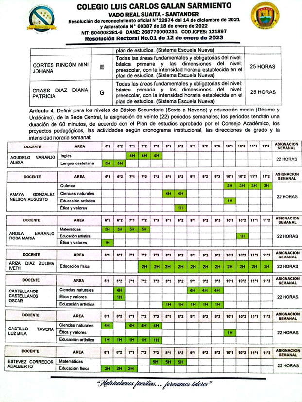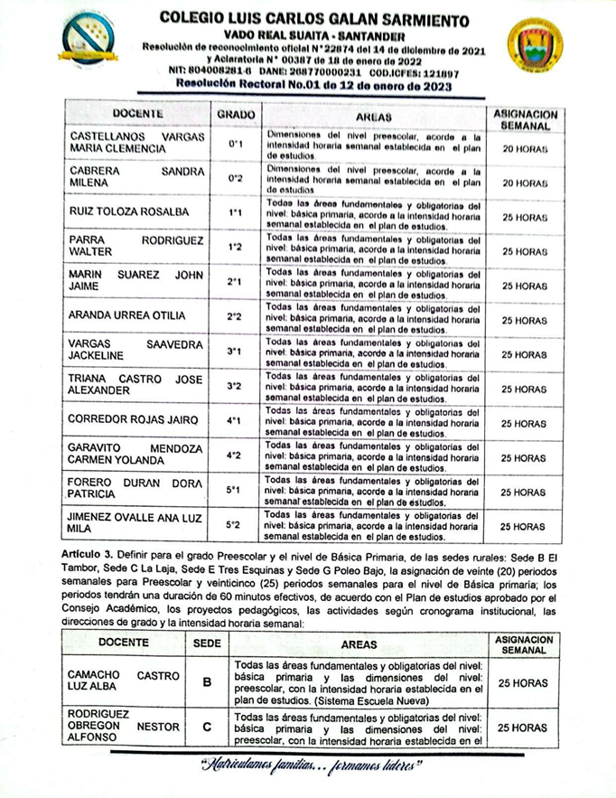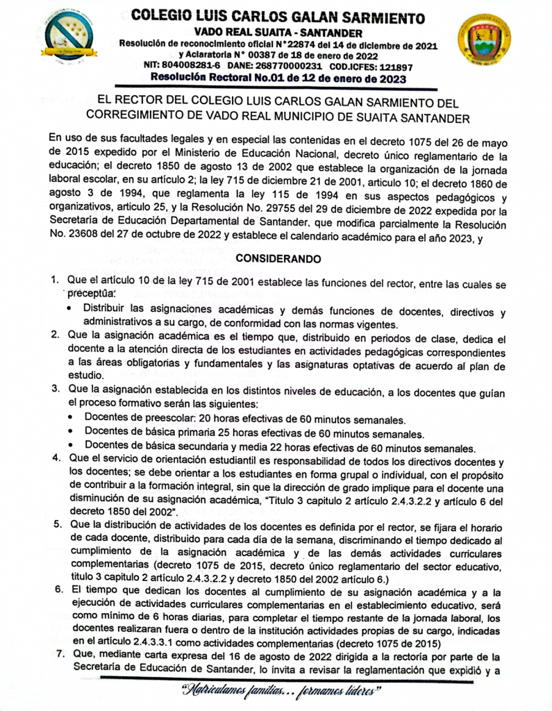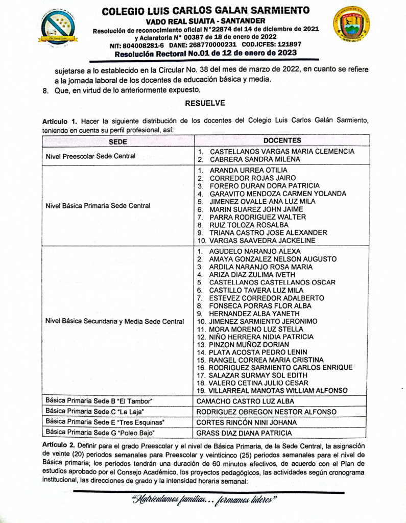 El Rector del COLEGIO LUIS CARLOS GALÁN SARMIENTO del corregimiento de Vado Real, municipio de Suaita, Santander, en uso de sus funciones legales y en especial las cantenidas en el decreto 1075 del 26 de mayo de 2015 expedido por el Ministerio de Educación Nacional, resulve hacer la distribución de los docentes del Colegio Luis Carlos Galán Sarmiento, teniendo en cuenta el perfil profesional del docente.
