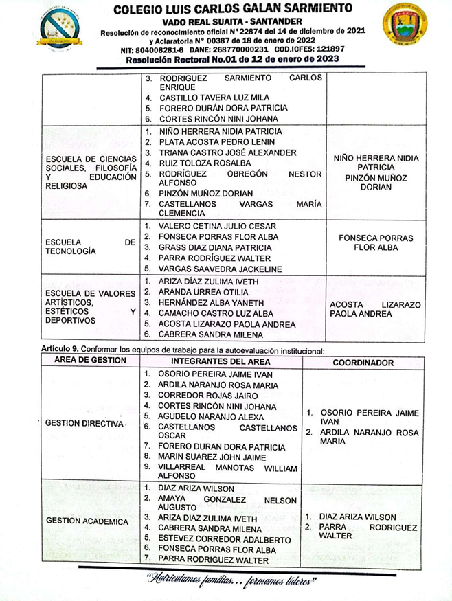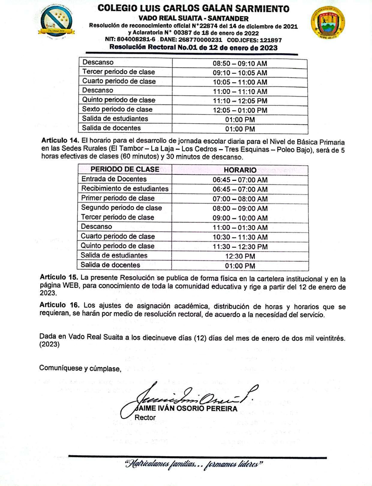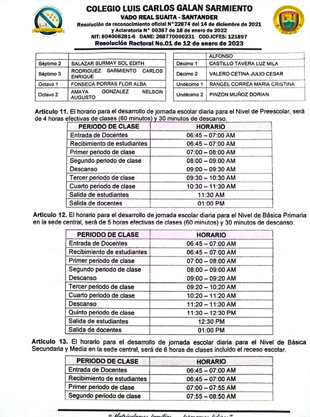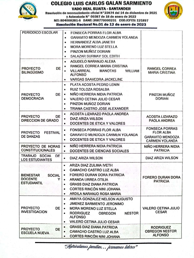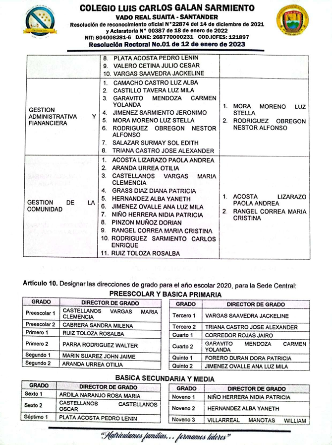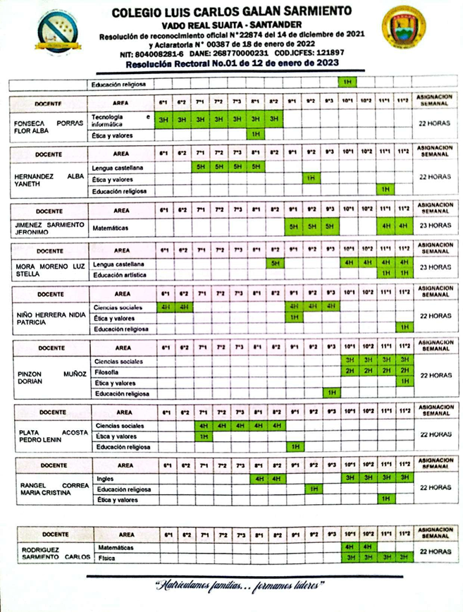 El Rector del COLEGIO LUIS CARLOS GALÁN SARMIENTO del corregimiento de Vado Real, municipio de Suaita, Santander, en uso de sus funciones legales y en especial las cantenidas en el decreto 1075 del 26 de mayo de 2015 expedido por el Ministerio de Educación Nacional, resulve hacer la distribución de los docentes del Colegio Luis Carlos Galán Sarmiento, teniendo en cuenta el perfil profesional del docente.